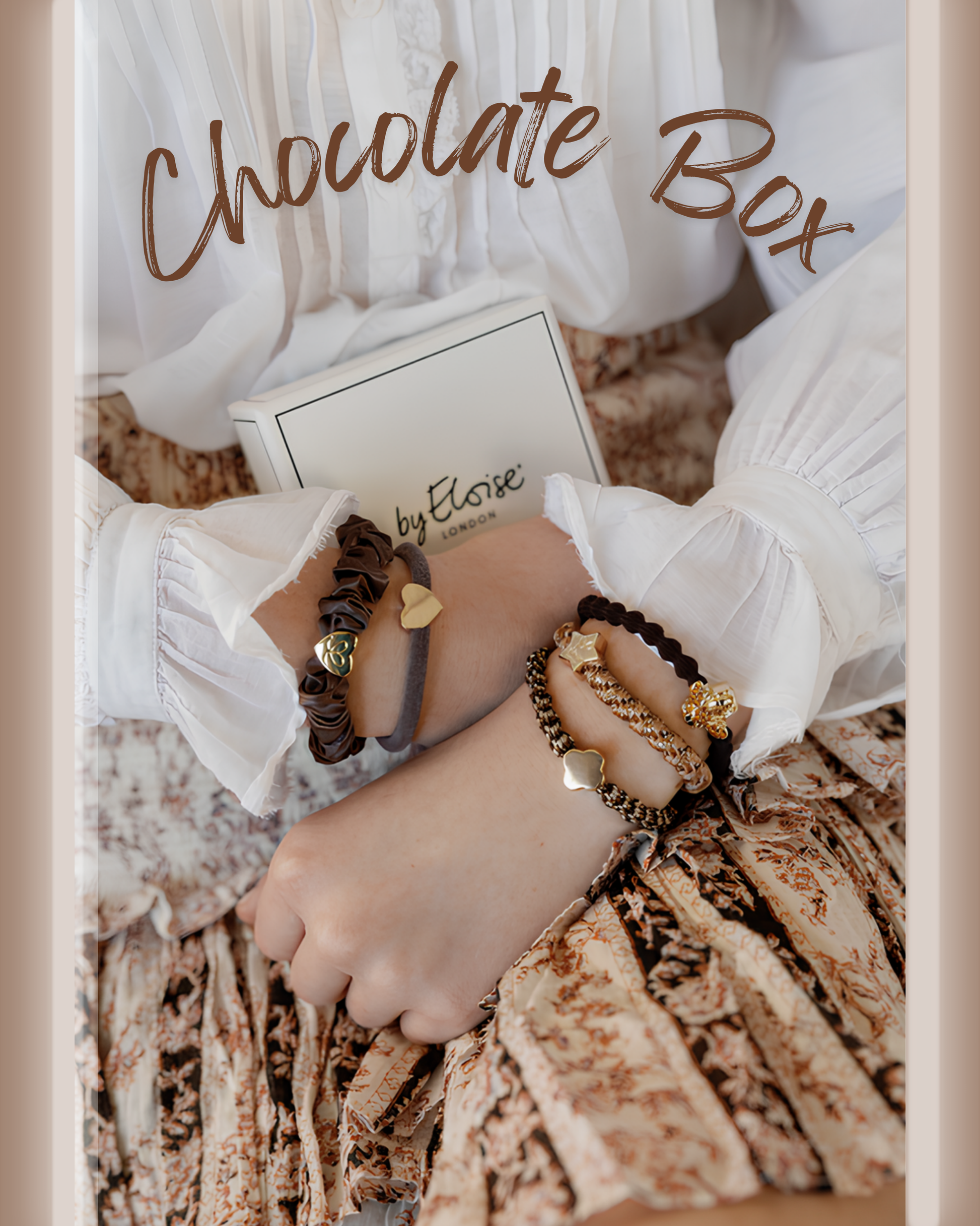 Stilvolles Haarband-Set von byEloise aus der „Chocolate Box“-Edition – mit Herz-Charm in Goldoptik, liebevoll verpackt.